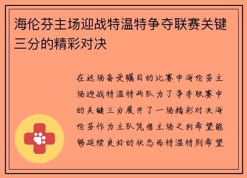 海伦芬主场迎战特温特争夺联赛关键三分的精彩对决